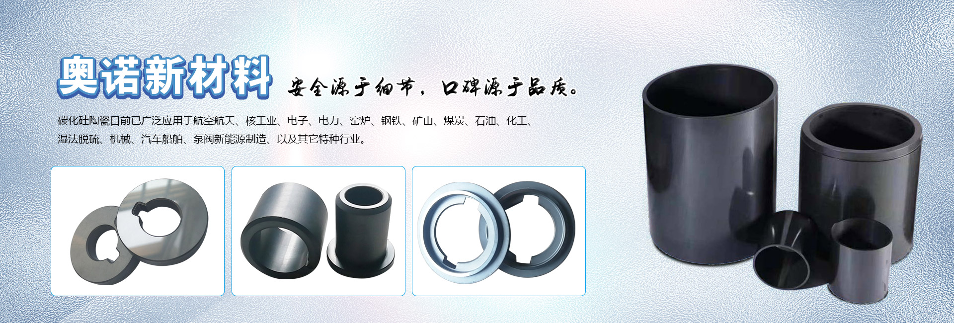 濰坊奧諾新材料有限公司坐落于美麗的山東半島中部風(fēng)箏都濰坊市坊子區(qū)。公司主要以研發(fā)生產(chǎn)經(jīng)營(yíng):無壓燒結(jié)碳化硅陶瓷、反應(yīng)燒結(jié)碳化硅陶瓷、碳化硅微粉及其它陶瓷制品、耐火材料等系列產(chǎn)品。 碳化硅陶瓷具有高強(qiáng)度、高硬度、高耐磨、耐腐蝕、耐高溫、抗氧化、耐急冷急熱、抗熱震性好、導(dǎo)熱好和熱效率高等基本性能和主要特點(diǎn),是工業(yè)陶瓷領(lǐng)域性能最好的產(chǎn)品之一。 碳化硅陶瓷目前已廣泛應(yīng)用于航空航天、核工業(yè)、電子、電力、窯爐、鋼鐵、礦山、煤炭、石油、化工、濕法脫硫、機(jī)械、汽車船舶、泵閥新能源制造、以及其它特種行業(yè)。公司擁有文化程度高、專業(yè)知識(shí)強(qiáng)、富有經(jīng)驗(yàn)的技術(shù)團(tuán)隊(duì),現(xiàn)場(chǎng)售后服務(wù)團(tuán)隊(duì)和銷售團(tuán)隊(duì)遍布全國(guó)各地。